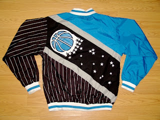 Old Pinstripe Road Warmups: I still think these are the best warmups the Magic ever wore. And really both of the original warmups were fantastic. The home warmups had a very professional look, showing off some of the pinstripes on the side while keeping it a simple white with the Magic logo on the front and back. But the road warmups were sublime. The front had Magic streaking across the chest with blue on top and the pinstripes on a black background. The greatness though is on the back where the logo is completed with the streaking ball. I really wish the Fan Attic were still open so I could get one!